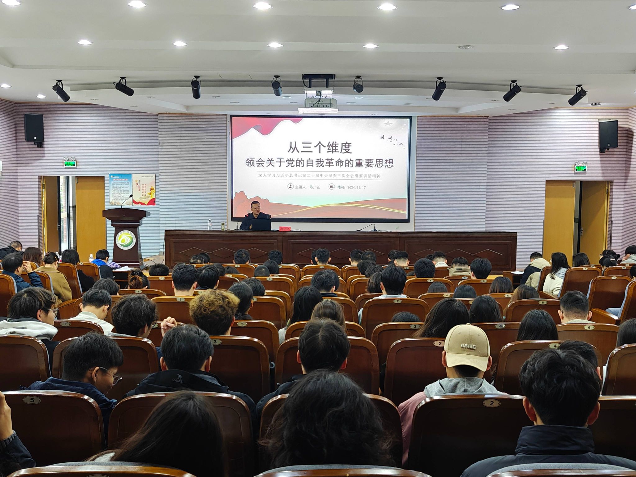 陈广正以《从三个维度领会关于党的自我革命的重要思想》为题,围绕“我们党为什么要自我革命”“我们党为什么能自我革命”和“我们党怎样推进自我革命”三个方面进行讲解。他强调,自我革命是党应对复杂环境、保持先进性和纯洁性的内在要求,是党的优良传统和独特优势。通过历史实例,他深刻剖析了党在不同历史阶段进行自我革命的必要性。