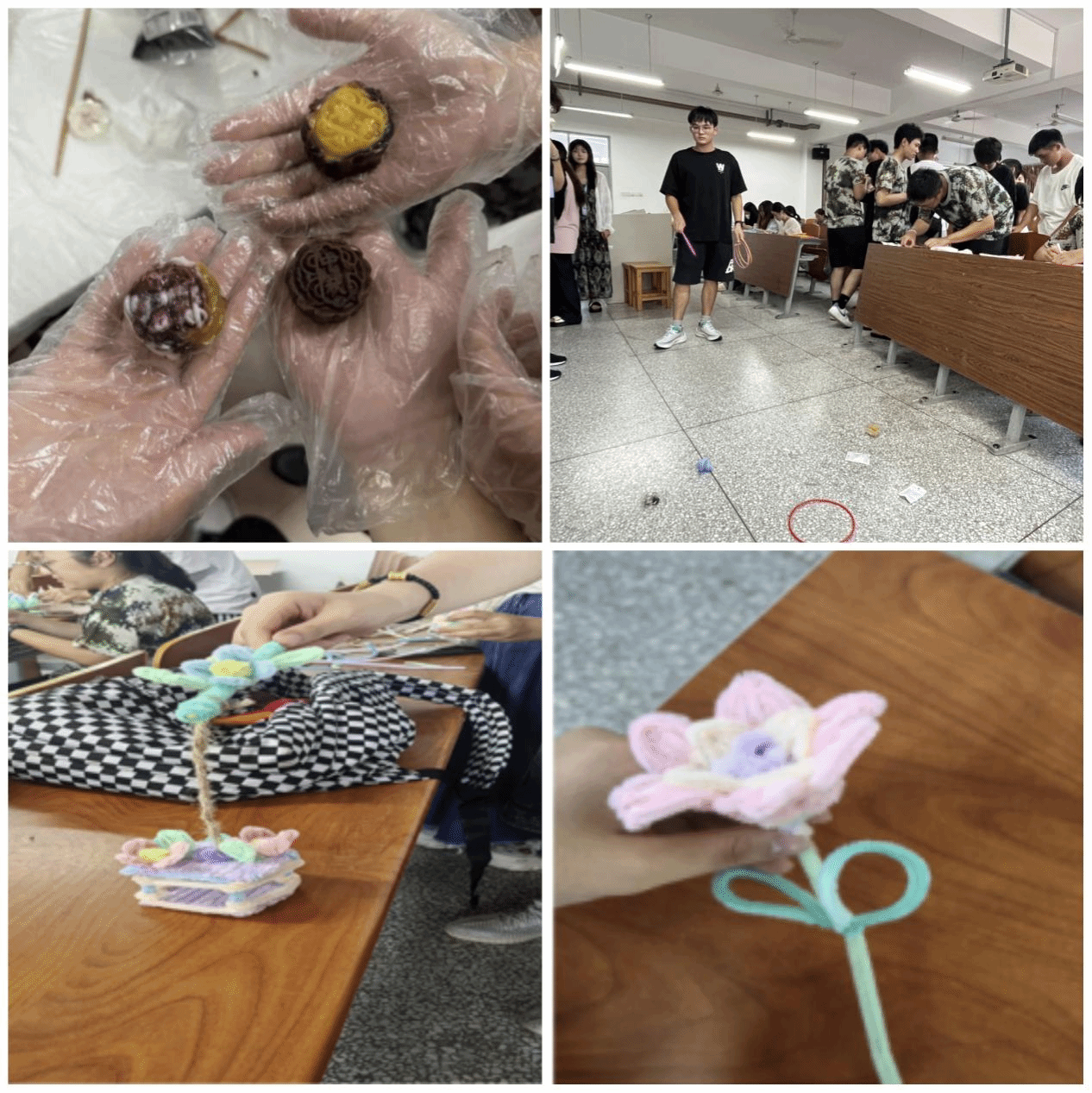 活动现场,同学们积极参与,气氛热烈。此次活动分为四个部分:DIY冰皮月饼制作、活力套圈、花灯制作、扭扭棒手工DIY。DIY冰皮月饼制作,同学们亲手包馅、压模,一枚枚精致可口的冰皮月饼逐渐成形;活力套圈中同学们围成一圈,竞相展示自己的投掷技巧;花灯制作过程中,大家发挥创意,将中秋元素融入花灯设计中,制作出一盏盏独具特色的花灯;扭扭棒手工DIY,同学们利用色彩斑斓的扭扭棒,创作出形态各异、栩栩如生的手工艺品。四个小活动共同营造了一个温馨、和谐、充满创意的中秋佳节氛围。