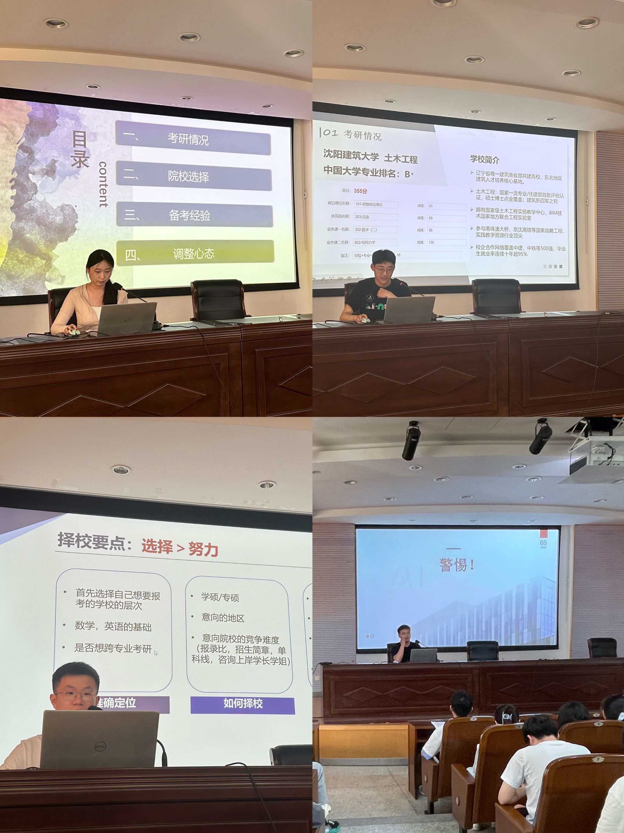 考研经验分享环节,成功上岸南京工业大学的刘玥寒、沈阳建筑大学的宋逍闲、扬州大学的孔令晖和桂林理工大学的宗瑞航等4位学长学姐依次上台,分享他们的考研经验。他们结合自身考研经历,从考研择校、各科复习方法、心态调整和时间管理等方面,倾囊相授自己的考研经验。在互动交流环节,同学们积极提问,就院校选择、复习资料挑选、复试注意事项等问题与学长学姐们进行了深入交流。同学们纷纷表示,通过这次经验分享,他们对考研有了更清晰的认识,也获得了许多实用的备考建议,受益匪浅。