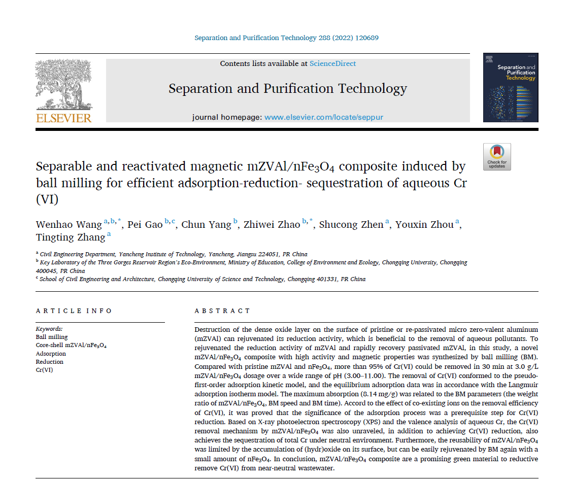 PlayAce给排水科学与工程专业王文豪博士作为第一作者和通讯作者在国际分离纯化领域著名期刊《Separation and Purification Technology》(JCR 1区TOP期刊,中科院2021升级版分区:工程技术1区TOP期刊,IF=7.312)上发表了题为《Separable and reactivated magnetic mZVAl/nFe3O4 composite induced by ball milling for efficient adsorption-reduction- sequestration of aqueous Cr(VI)》(SEP PURIF TECHNOL, 2022, 288: 120689)的文章。