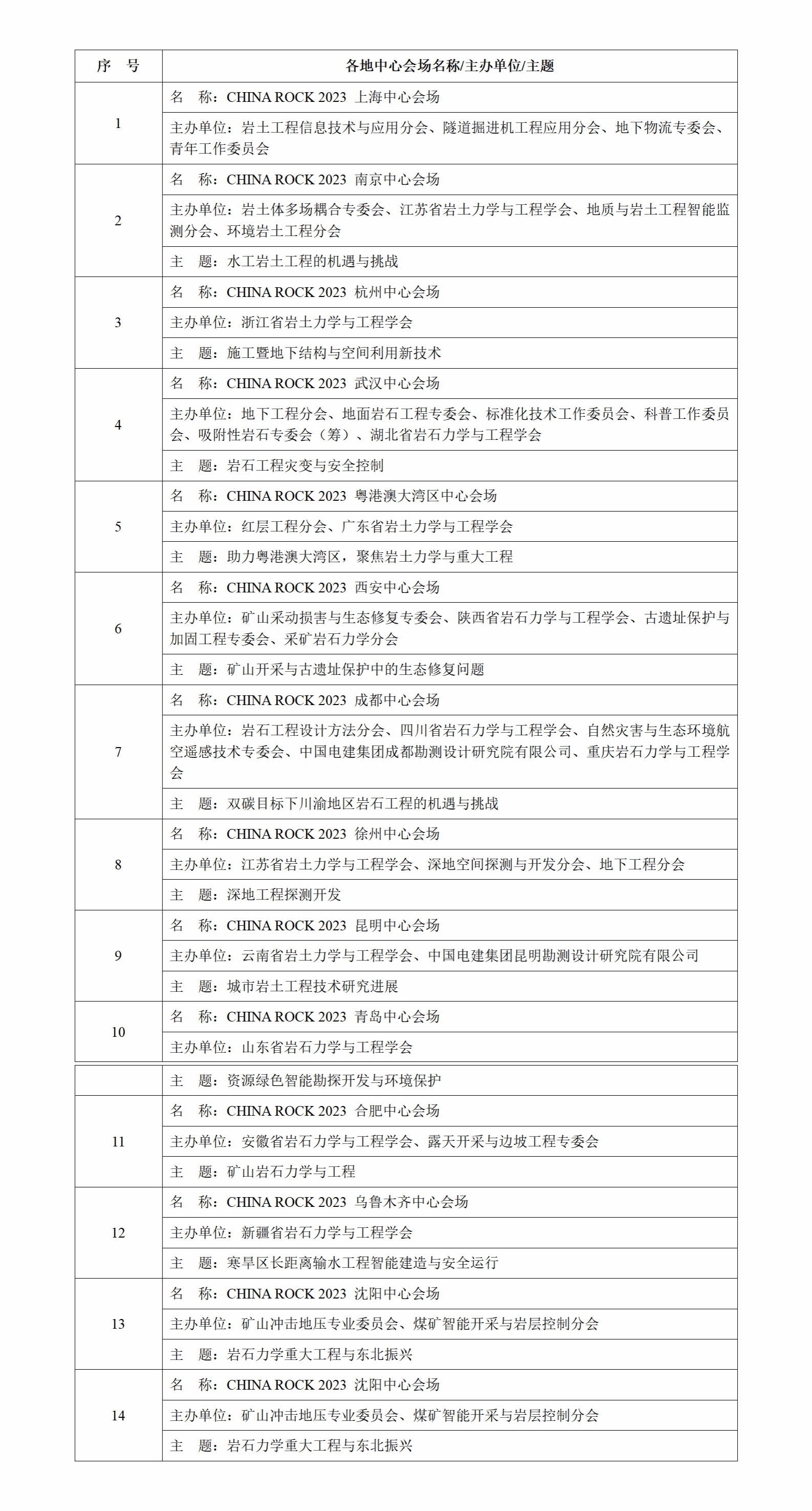 为了加强我国岩石力学与工程领域的学术交流,促进岩石力学与岩土工程领域科技创新,经研究决定,于2023年10月20-22日召开“CHINA ROCK 2023第二十次中国岩石力学与工程学术年会”。为更好地秉承“规模化、国际化、一体化”办会精神,服务好广大岩石力学与工程相关领域在校员工和青年会员,将在京外组织各地中心会场。北京主会场将设置不同议题的分会场。现将会议有关事项通知如下:时间:2023年10月20-22日(10月20日报到)