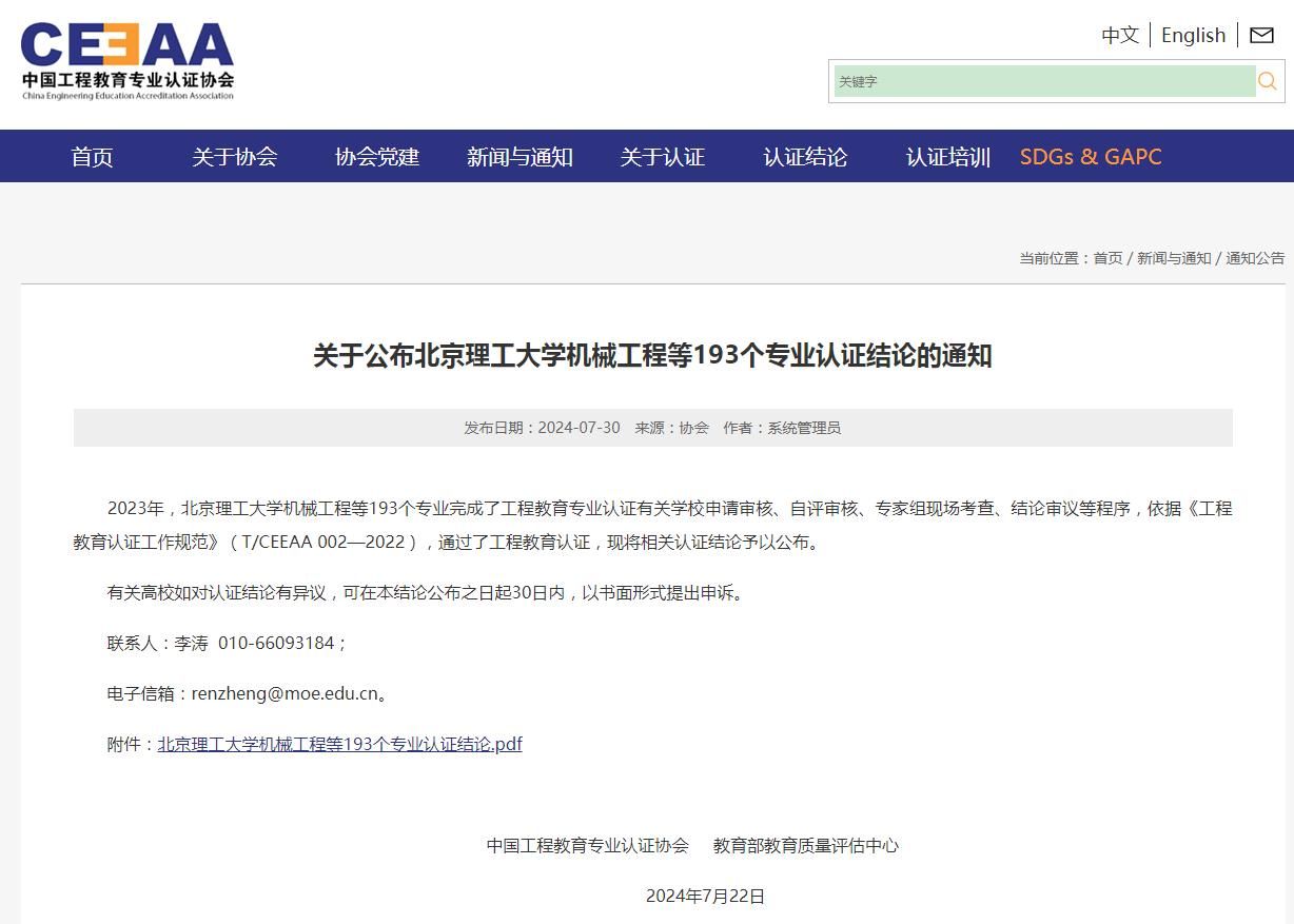 近日,中国工程教育专业认证协会发布《关于公布北京理工大学机械工程等193个专业认证结论的通知》,公布了2023年度全国工程教育专业认证的认证结论。公司土木工程专业再次通过工程教育认证,认证有效期6年(2024年1月至2029年12月)。
