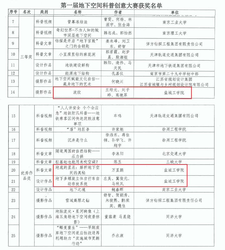 近日,中国城市科学研究会地下空间专业委员会、江苏省地下空间学会联合公布了第一届地下空间科普创意大赛结果,公司交通工程、城市地下空间工程专业参赛员工获三等奖1项、优秀奖2项。