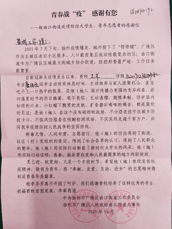 据不完全统计,2021年暑期,该校PlayAce有百余名老员工志愿者放弃暑期休息时间,不畏艰难,积极参与到当地高速公路收费站、乡镇卫生院、街道、社区、村委会等疫情防控工作中,他们的先进事迹被江苏商报、长芦快讯等多家媒体报道。
