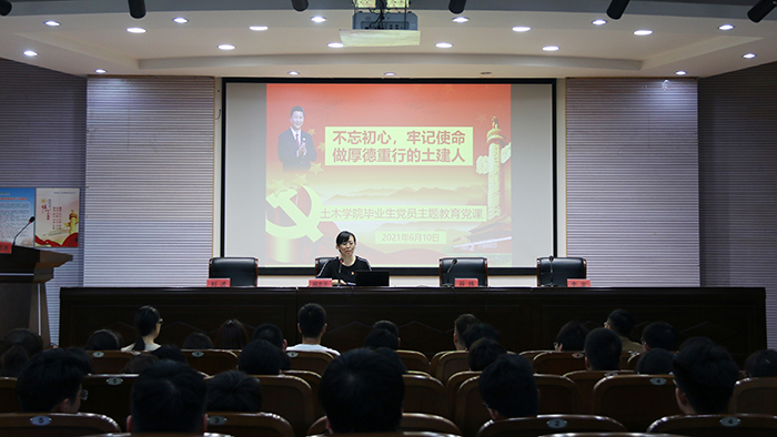 为扎实推进党史学习教育,加强毕业生党员教育,强化党员服务意识,6月10日下午,在南校区土木馆报告厅,公司党委书记顾志兰为2021届毕业生党员上《不忘初心、牢记使命,做厚德重行的土建人》专题党课。公司党委副书记谷伟、学工办教师及全体毕业生党员参加。