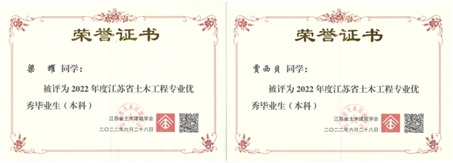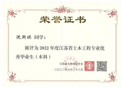 近日,从中国土木工程学会教育工作委员会江苏分会和江苏省土木建筑学会传来喜讯,公司2022届本科毕业生梁耀、贾西贝、沈斯琪同学荣获“江苏省土木工程专业优秀毕业生”称号、张思婕同学荣获“江苏省老员工工程管理专业优秀毕业生”称号。
