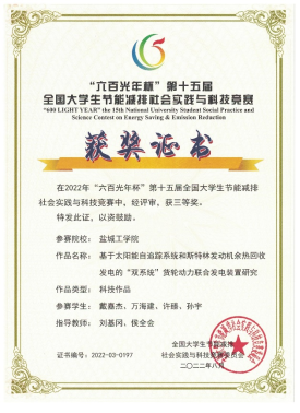 3 | 汽车公司 | 基于太阳能自追踪系统和斯特林发动机余热回收发电的“双系统”货轮动力联合大点装置研究 | 戴嘉杰 | 刘基冈 侯全会 | 三等奖 |