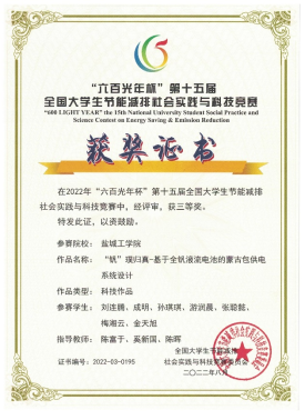 5 | 材料公司 | “钒”璞归真-基于全钒液流电池的蒙古包供电系统设计 | 刘连腾 | 陈富于 奚新国 陈晖 | 三等奖 |