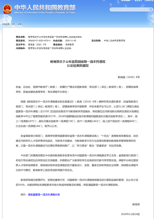 11月30日,教育部官网正式发布了《关于公布首批国家级一流本科课程认定结果的通知》(教高函[2020]8号),认定5118门课程为首批国家级一流本科课程(含1559门在促进信息技术与公司产品深度融合,特别是在应对新冠肺炎期间实施的大规模在线教学中作出了重要贡献的原2017年、2018年国家精品在线开放课程和国家虚拟仿真实验教学项目)。其中,线上一流课程1875门,虚拟仿真实验教学一流课程728门,线下一流课程1463门,线上线下混合式一流课程868门,社会实践一流课程184门。