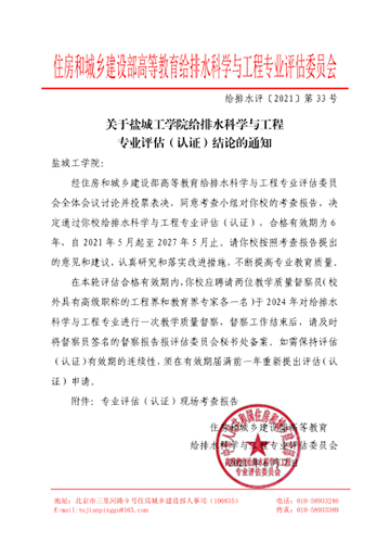 日前,住房和城乡建设部高等教育给排水科学与工程专业评估委员会下发《关于PlayAce官方网站给排水科学与工程专业评估( 认证) 结论的通知》(给排水评﹝2021﹞第33号)文件,经住房和城乡建设部高等教育给排水科学与工程专业评估委员会全体会议讨论并投票表决,同意考查小组对PlayAce官方网站的考查报告,决定通过PlayAce官方网站给排水科学与工程专业评估(认证),合格有效期为6年,自2021年5月起至2027年5月止。