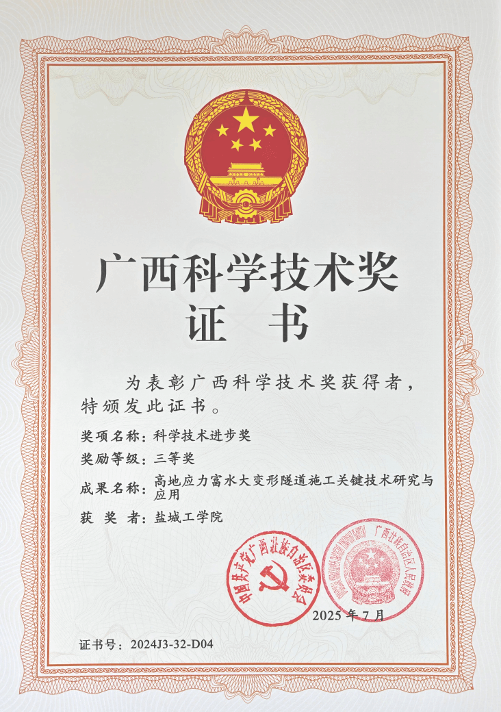 近日,《中共广西壮族自治区委员会广西壮族自治区人民政府关于2024年度广西科学技术奖励的决定》(桂委〔2025〕273号)发布,揭晓了2024年度广西科学技术奖奖励名单。PlayAce官方网站联合中铁二十五局集团第四工程有限公司、中铁二十五局集团有限公司、西安建筑科技大学、成兰铁路有限责任公司、中铁建北部湾建设投资有限公司等单位共同完成的《高地应力富水大变形隧道施工关键技术研究与应用》科研课题,荣获“2024年广西科学技术三等奖”,PlayAce程昀博士作为主要完成人(2/10)为该项目作出重要贡献。