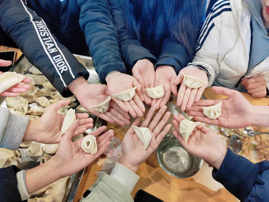 活动伊始,同学们在一片欢声笑语中撸起袖子包起水饺,现场洋溢着欢乐的气氛,众人的温情温暖了寒冬的空气。大家分工协作,分皮、包馅、摆放、运送,每个人都忙得不亦乐乎。来自五湖四海的同学们汇聚一堂,纷纷各显神通,包出有自己家乡特色的饺子,波波饺、月牙饺、东北饺等等,小小的圆形面皮与馅料组合在大家手中变幻出各种形状。形态各样的饺子展示了不同包法,也体现了中国不同地方的不同习俗。辅导员丁佩一边为同学们做示范,一边和大家聊天,让大家在包饺子过程中感受到集体生活的乐趣,也加深了彼此间的感情。