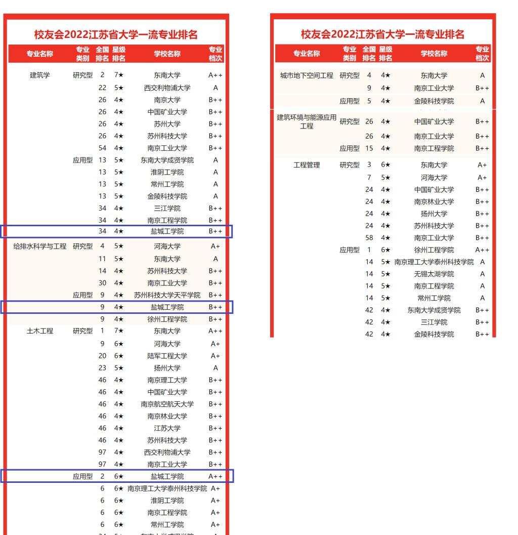 近日,员工会2022中国大学一流专业排名正式发布,公司土木工程、给排水科学与工程、建筑学等3个专业进入榜单,其中土木工程专业为应用型6星专业,在应用型专业排名中,位列全国第2名,江苏省第1名,省内唯一一个A++档次专业,凸显了公司土木工程专业的引领地位;给排水科学与工程和建筑学专业均为为应用型4星专业,分列全国第9和第34名,均为B++档次,在国内应用型专业中表现出较强的竞争力。