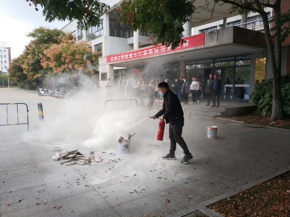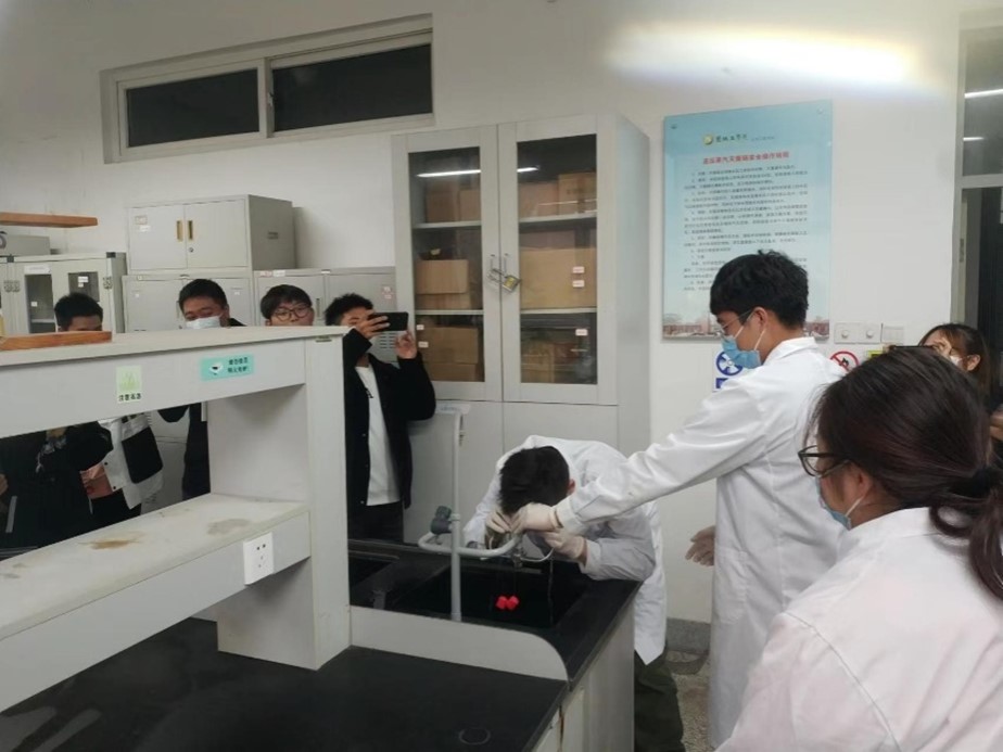 培训结束后,公司在土木馆A楼前组织开展了火灾扑灭演练,员工代表操练了灭火器和灭火毯的使用方法;给排水专业的师生在土木馆A104开展了危化品安全事故应急演练,廖钰冰和张婷婷老师具体介绍了实验相关危险化学试剂潜在的安全隐患和正确使用方法,并遵循应急处理流程,指导员工演练了试剂洒落应急处置、洗眼等紧急救治过程。