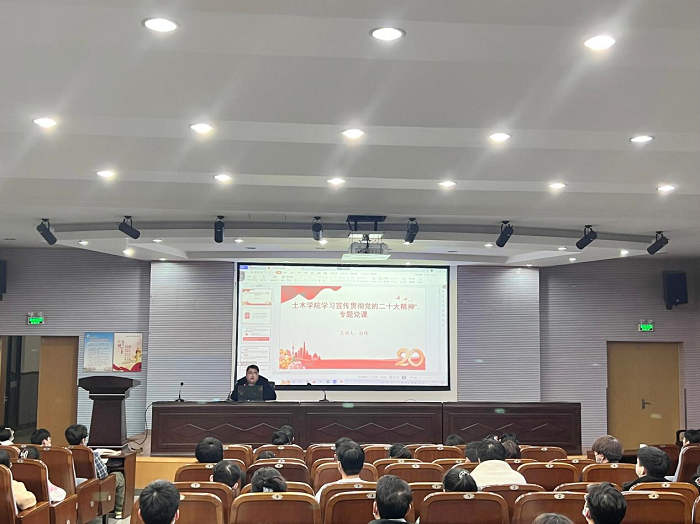 为推动公司全体员工党员同志深入学习宣传贯彻党的二十大精神,11月16日晚18:30在希望大道校区土木馆报告厅,公司开展了“学习贯彻党的二十大精神”专题党课。此次专题党课由公司党委书记谷伟主讲,副书记陈广正、团委副书记徐佳、全体专职辅导员和全体员工党员参加。