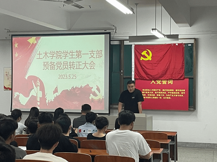 随后,由李志等25名申请转正的预备党员依次上台汇报预备期内的思想、学习、工作以及生活上的感悟、收获及表现等情况。其次,入党介绍人汇报对预备党员的培养、教育和考察情况,并对该同志是否按期转正进行表态。再次,与会党员发表意见并表态,所有正式党员对李志等25位同志预备期以来的表现逐个进行评议,经无记名投票,全票通过了李志等25名同志的转正申请,同意他们按期转正。花宇带领新党员宣读入党誓词,其他党员重温入党誓词。