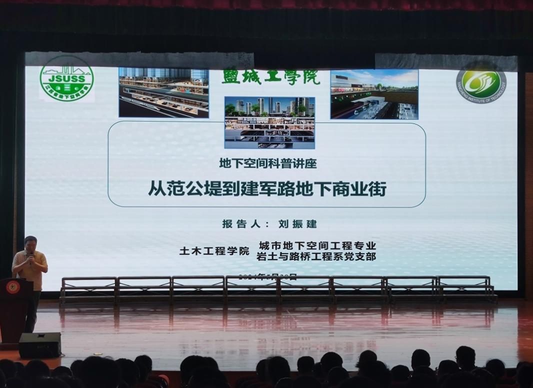 活动由盐城市新洋第二实验公司董事长祝成荣主持。公司城市地下空间工程专业刘振建博士为该校360余名七年级员工作了主题为《从范公堤到建军路地下商业街》的科普讲座。讲座中,刘博士从范仲淹撒糠打桩定堤址,介绍了范公堤与海岸线变迁的故事,讲述了建军路地下商业街与盐城城市建设,分享了国内外地下空间典型工程案例和新技术,生动精彩的讲座开拓了员工的视野,赢得同学们阵阵掌声。此外,刘博士还介绍了钱七虎院士在地下空间方面的先进事迹,鼓励员工好好学习、勤勉笃实、科教报国。