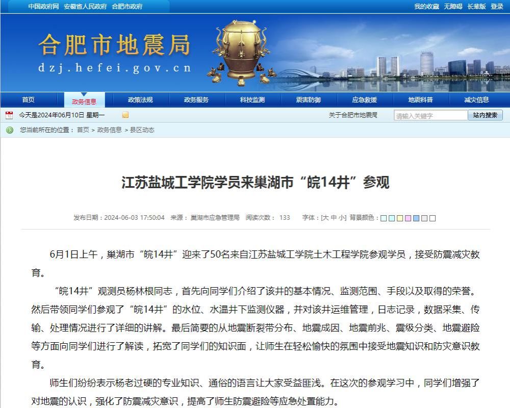 近日,公司土木工程、城市地下空间工程专业员工在巢湖工程地质实习期间,参观巢湖市“皖14井”,观测员杨林根同志进行了全程讲解。安徽省地震局、合肥市地震局分别对此进行了新闻报道。
