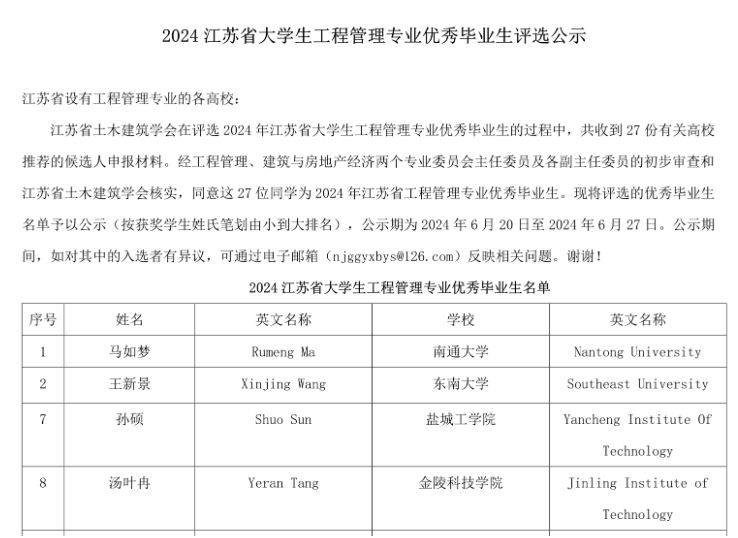 近日,从江苏省土木建筑学会传来喜讯,公司2024届本科毕业生孙硕同学荣获“江苏省老员工工程管理专业优秀毕业生”称号。