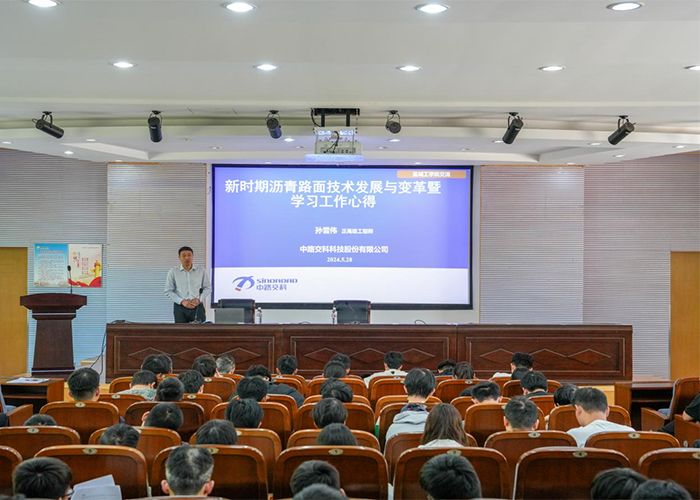 孙雪伟教授对中路交科科技股份有限公司进行了简要介绍,围绕沥青路面结构、道路结构健康一体化快速检测、半刚性基层裂缝微创注浆、沥青路面智慧管控、耐久性桥隧铺装、桥梁无缝式伸缩缝和无车辙路面技术等进行了系统介绍,展示了公司在上述诸方面开展的技术创新,分享了他从事路桥工作二十多年来的心得体会,激发了员工们的浓厚兴趣。讲座后,孙雪伟教授还参与了土木工程专业交通土建工程方向的毕业设计评阅工作,对毕业设计工作提出了针对性建议。