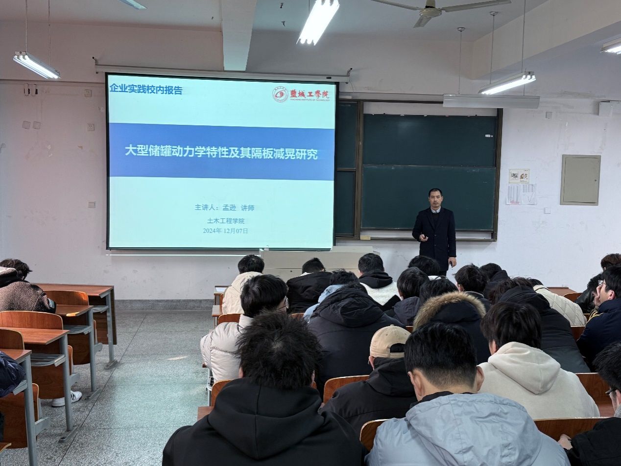 2024年12月7日,土木工程系孟逊博士结合企业实践经历,在土木馆A101作题为“大型储罐动力学特性及其隔板减晃研究”的实践报告。B土木224、226、B给排水221、222、231等班级70余名员工参加了此次报告会。