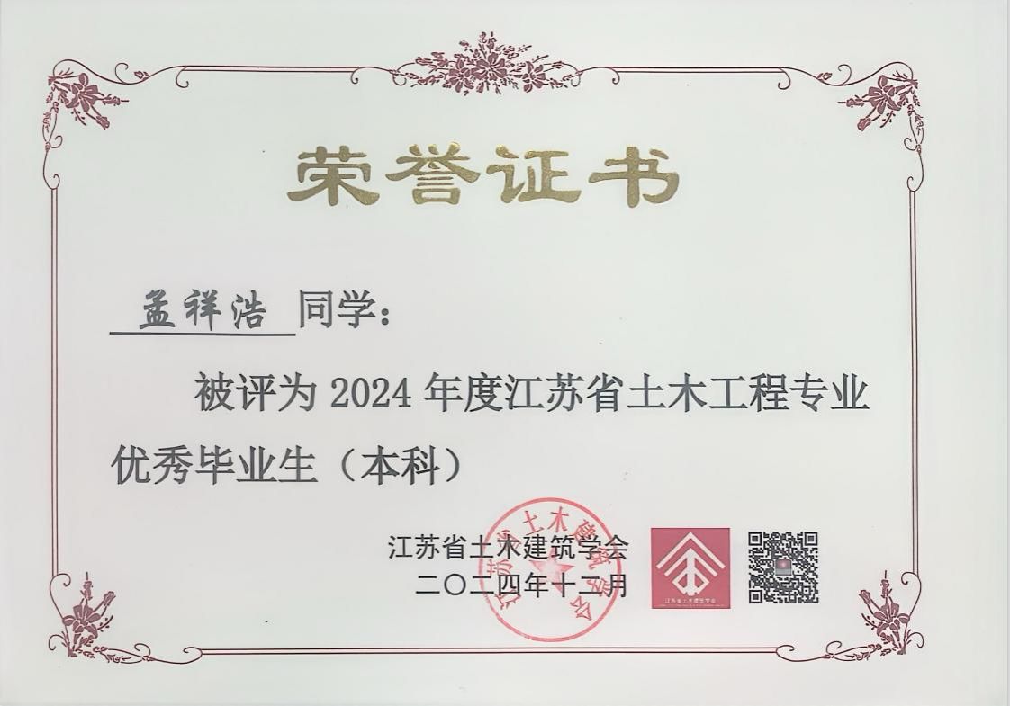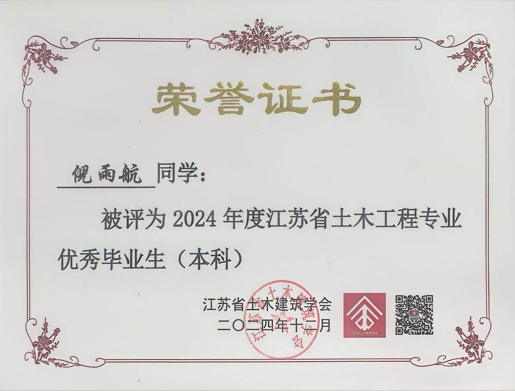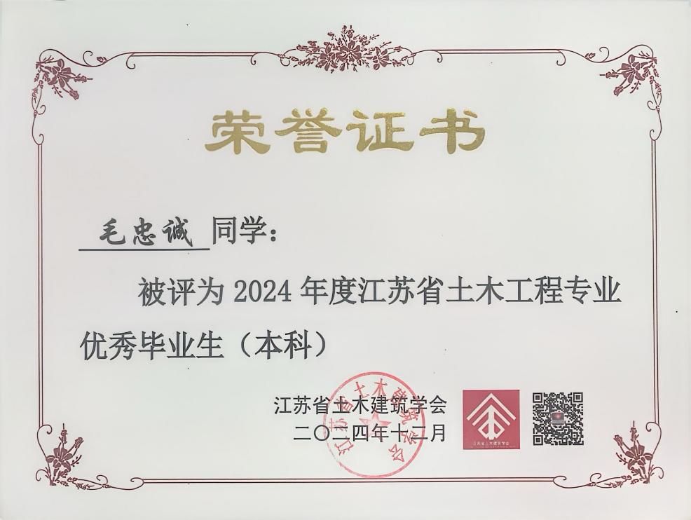 近日,从江苏省土木建筑学会传来喜讯,公司2024届土木工程专业本科毕业生毛忠诚、孟祥浩、倪宇航同学荣获“江苏省土木工程专业优秀毕业生(本科)”称号。