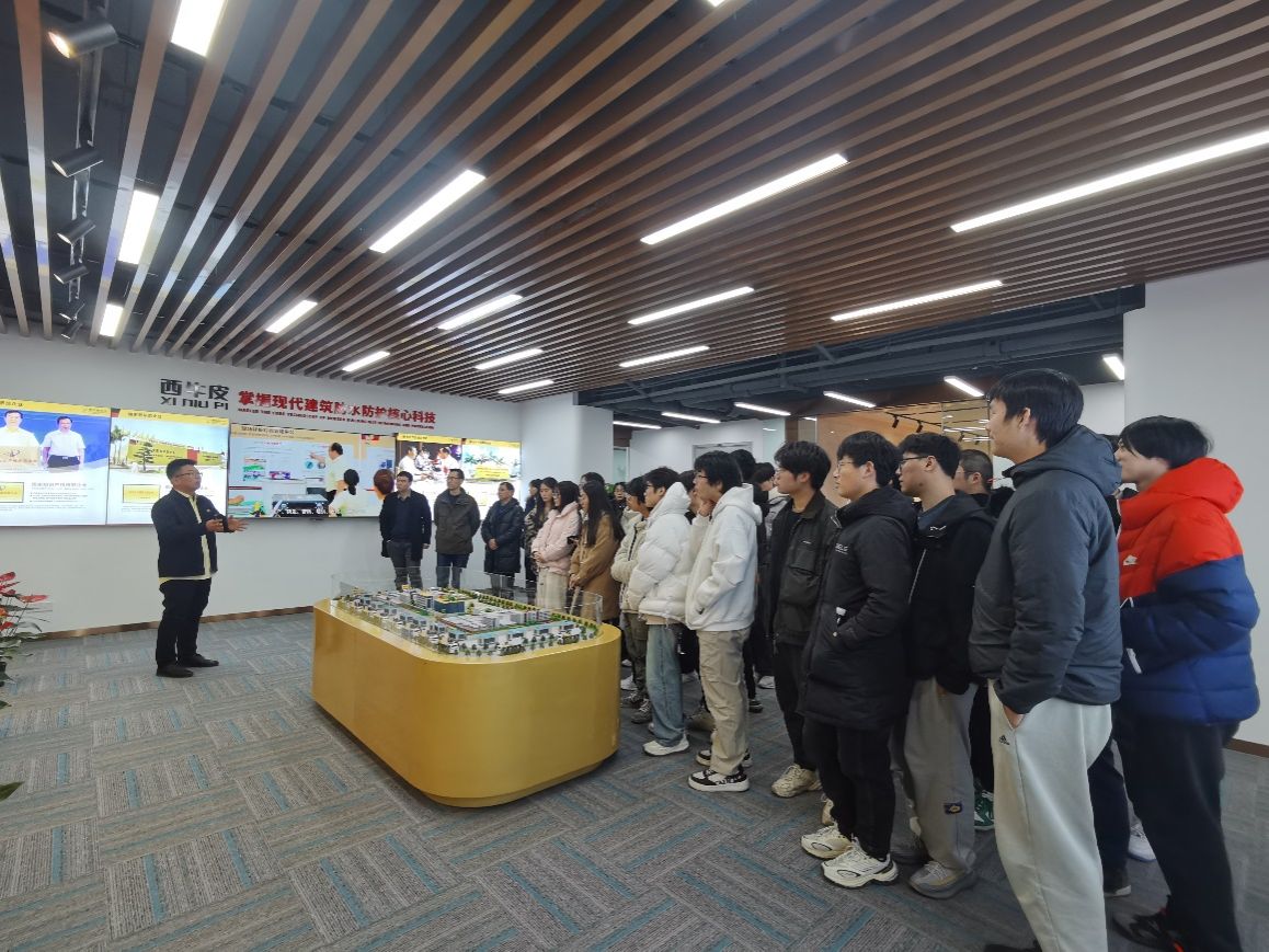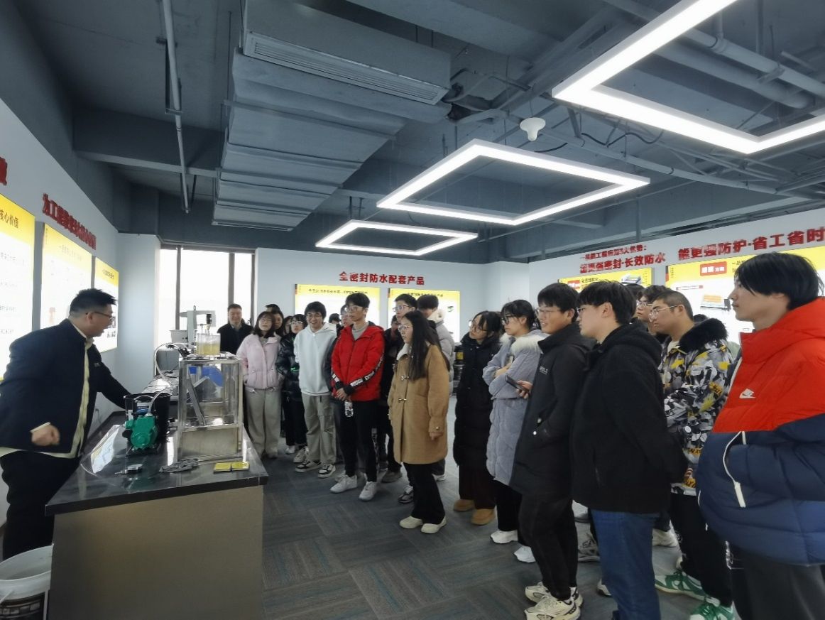 在南京西牛皮防水科技有限公司,技术专家张显为同学们着重介绍了地下工程中新型防水结构与材料应用技术要点,带领大家走访了公司防水产品工地场景应用展厅,同学们亲身体验了公司产品的创新点和技术优势。