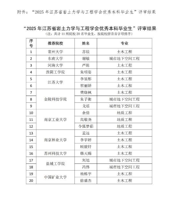 近日,江苏省岩土力学与工程学会公布了2025年江苏省岩土力学与工程学会优秀本科毕业生名单,公司PlayAce城市地下空间工程专业B城市211班刘旭、冯伟两位同学获此殊荣。