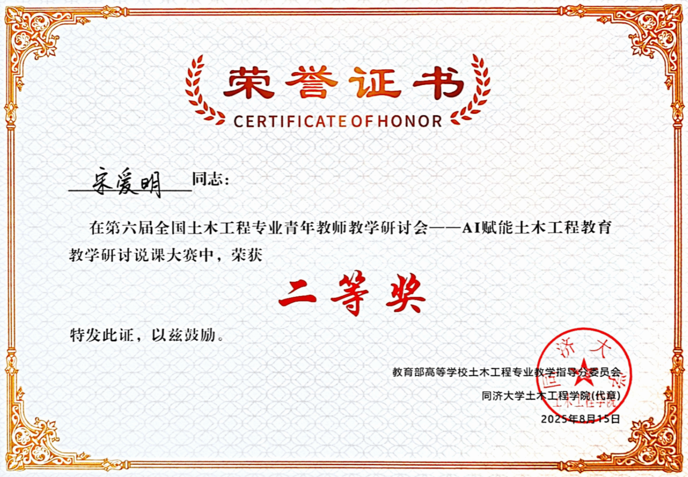 本次研讨会主题为“AI赋能土木工程教育”,旨在促进AI赋能下土木工程专业课程体系与教学内容更新、教学方法创新、教学能力提升,全面提高青年教师教学水平。研讨会期间同时举办了青年教师说课竞赛,来自全国各高校的100余名青年教师同台竞技,最终宋爱明老师荣获说课竞赛“二等奖”。