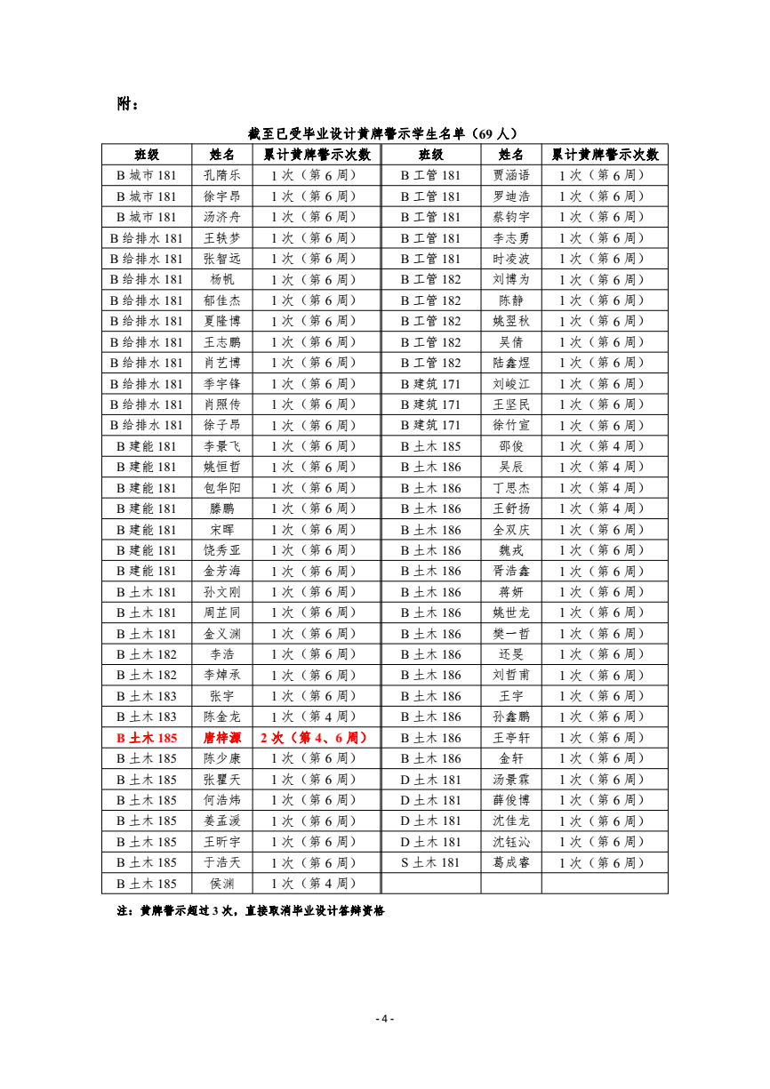 (2)针对已被黄牌警示2次的同学,教科研办公室将联合学工办、专业系,召开毕业设计员工及其指导老师、系主任、辅导员专项督查会,了解毕业设计困难,督促其毕业设计尽快跟上进度,并明确告知黄牌警示超过3次,将取消毕业设计答辩资格。