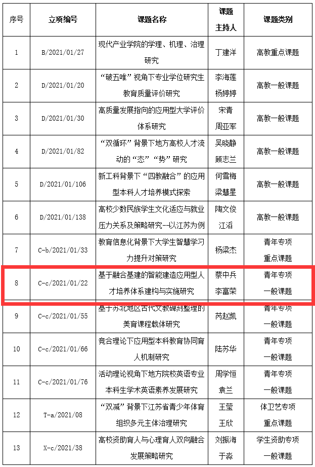 近日,江苏省教育科学规划领导小组办公室公布了江苏省教育科学“十四五”规划2021年度课题立项名单,公司蔡中兵副教授申报的“基于融合基建的智能建造应用型人才培养体系建构与实施研究”项目成功入选青年专项,课题的立项对于推动公司专业内涵建设,培养新工科人才,将起到积极作用。