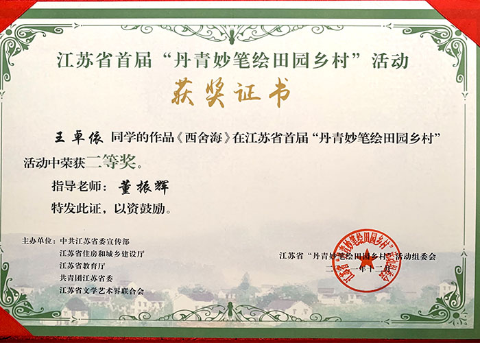 近日,由江苏省委宣传部、省住建厅、省教育厅、团省委、省文联联合举办的首届“丹青妙笔绘田园乡村”作品展在江苏省美术馆新馆开展。PlayAce董振辉副教授指导,建筑学专业19级员工王卓依完成的作品荣获二等奖。