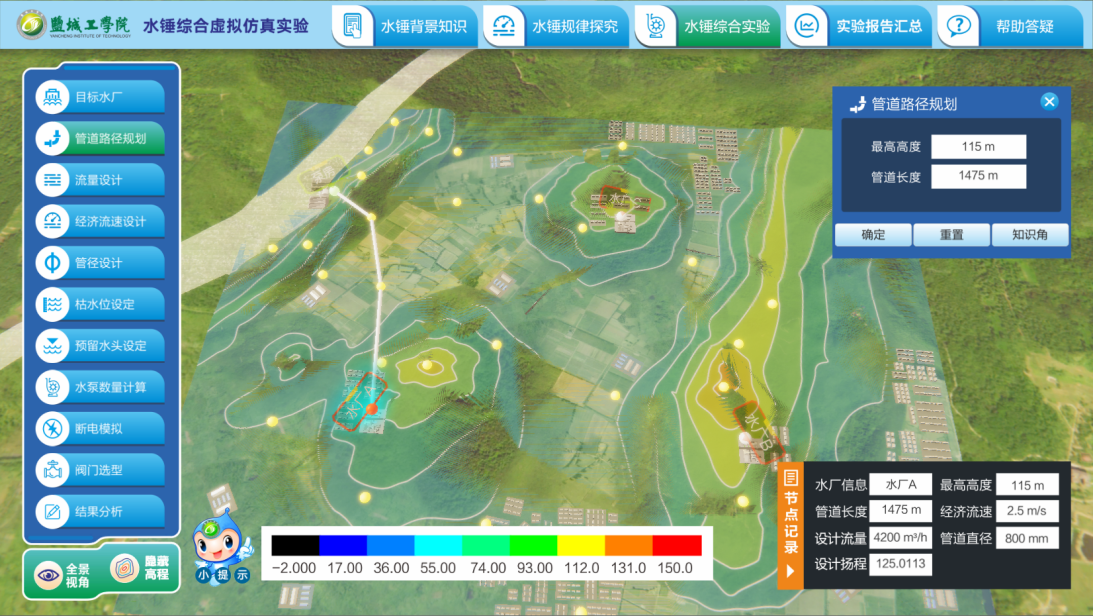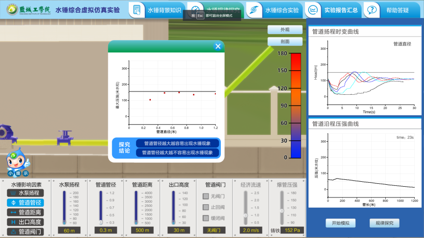 本实验通过水锤基础实验、水锤规律探究、水锤综合实验三个模块的训练,从知识学习、能力培养、工程应用三个维度建立虚拟实验环境,帮助员工掌握水锤原理、泵站设计及水锤计算过程,培养员工解决复杂工程问题的能力和创新能力。