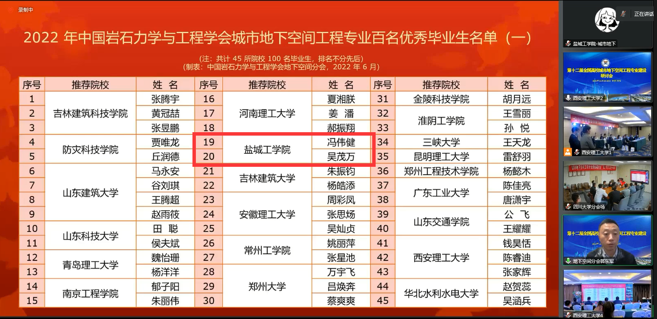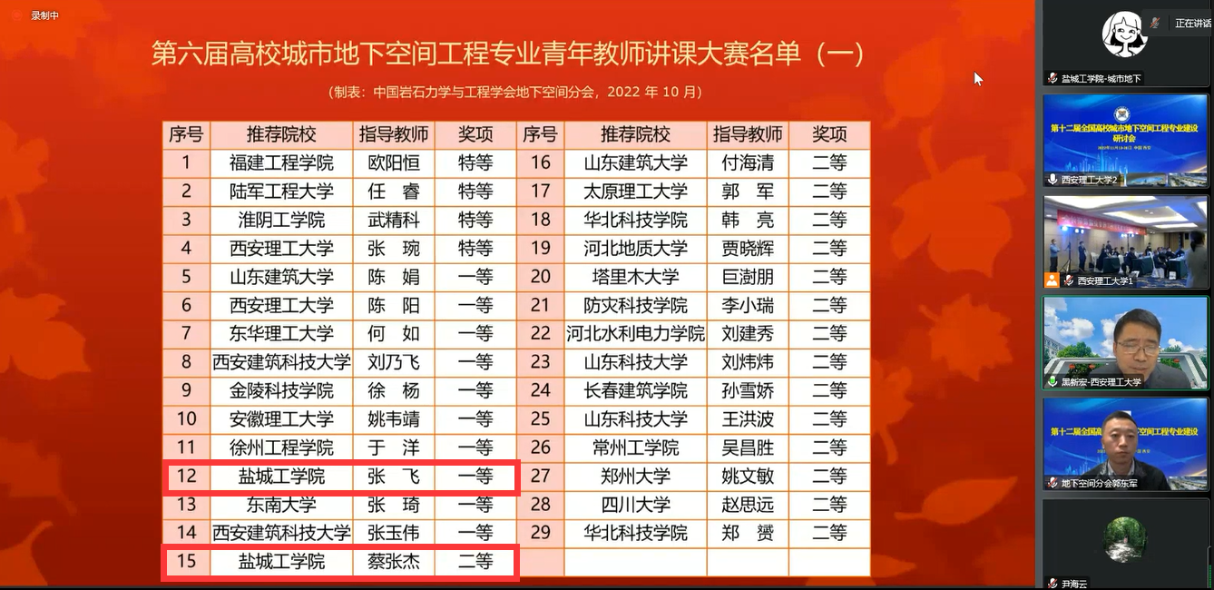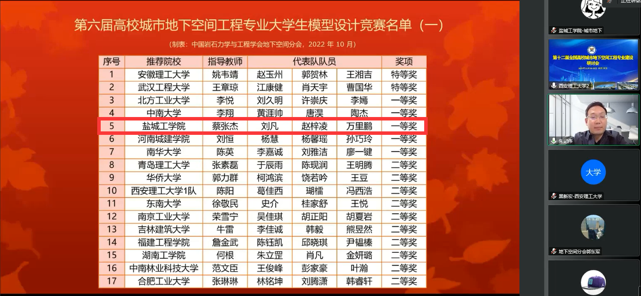 研讨会闭幕式上,大赛组委会宣布了全国城市地下空间工程专业2022届优秀毕业生名单、第六届城市地下空间工程专业青年教师讲课比赛获奖名单、第六届城市地下空间工程专业老员工模型设计大赛获奖名单。公司城市地下空间工程专业18级冯伟健、吴茂万两位同学获全国优秀毕业生,张飞、蔡张杰老师分获讲课比赛一、二等奖,城市地下空间工程专业刘凡、赵梓凌、万里鹏三位同学组成的PlayAce官方网站代表队(指导老师:蔡张杰)获老员工模型设计竞赛一等奖。