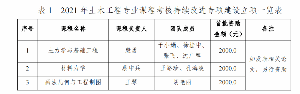 根据盐工土木〔2021〕10号文件要求,经课程团队申报,公司审核等程序,决定将材料力学等3门课程考核作为持续改进专项建设项目,进行立项建设,详见表1。