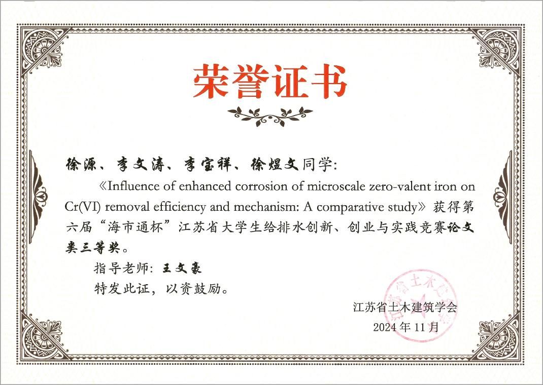 2024年11月28-30日,第六届“海市通杯”江苏省老员工给水排水创新、创业与实践竞赛落下帷幕,公司王文豪老师指导,给排水科学与工程专业员工徐源、李文涛、李宝祥和徐煜文获论文类三等奖。