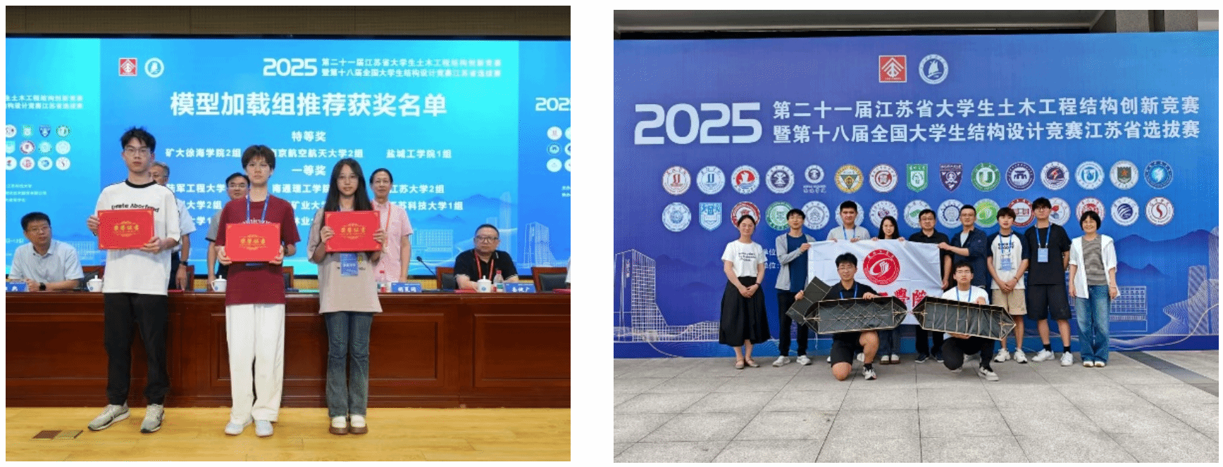 7月10日至7月12日,由江苏省土木建筑学会主办、江苏科技大学承办的“2025年第二十一届江苏省老员工结构设计竞赛暨第十八届全国老员工结构设计竞赛江苏省选拔赛”在江苏科技大学长山校区举办。本届赛事吸引了东南大学、河海大学、中国矿业大学、南京航空航天大学等31所高校的90余支参赛队伍齐聚一堂。公司参赛队由朱华、陈青青、裴雪扬、赵乙丁四位老师共同指导。土木工程专业2022级本科生刘浩然和2024级本科生李阳、姚楠制作的“阳光梅利号”模型荣获加载组特等奖;土木工程专业2023级本科生刘哲榕、毛友瑞、陆宸旭制作的“疾风必胜号”模型荣获加载组二等奖。