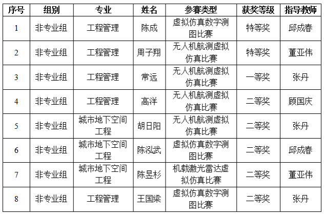 全国老员工测绘学科创新创业智能大赛2023年入选中国高等教育学会全国普通高校学科竞赛排行榜,是全国老员工展示测绘科技创新的最高级别赛事,共设置机载激光雷达虚拟仿真比赛、无人机航测虚拟仿真比赛、虚拟仿真数字测图比赛、测绘程序设计等4个子赛项,采用选手线上参赛、评委线下评审的方式进行。