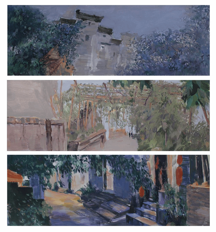孙乐言同学的创作对象是自己的家乡所在地——南京市栖霞区西岗街道桦墅村周冲组。作品选取了桦墅村的桦树古树、马头墙、里巷等作为创作元素,以组画的形式进行了分解重构,真切地展现了桦墅风貌。作品遵循构图美学,虚实结合,注重冷暖对比,笔法轻快。