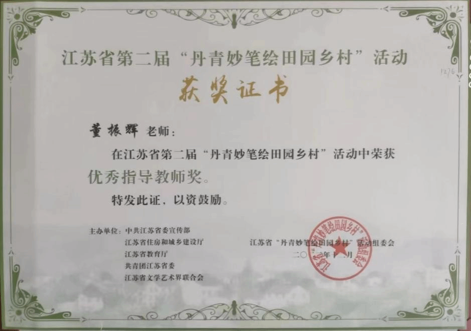 近日,由董振辉老师指导的,B建筑201班孙乐言同学的作品《故里桦墅》在江苏省第二届《丹青妙笔绘田园乡村》活动中荣获二等奖。