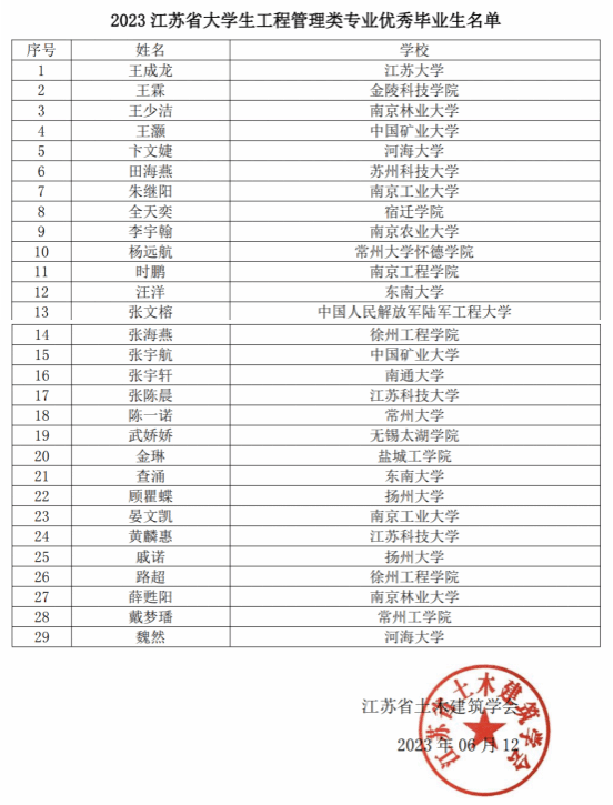 据悉“江苏省老员工工程管理专业优秀毕业生”是由江苏省土木建筑学会组织评选,评选包含江苏省内各高校推荐、江苏省土木建筑学会工程管理专业委员会和建筑与房地产专业委员会初步审查、主任委员核查,江苏省土木建筑学会确认和评选公示等环节。