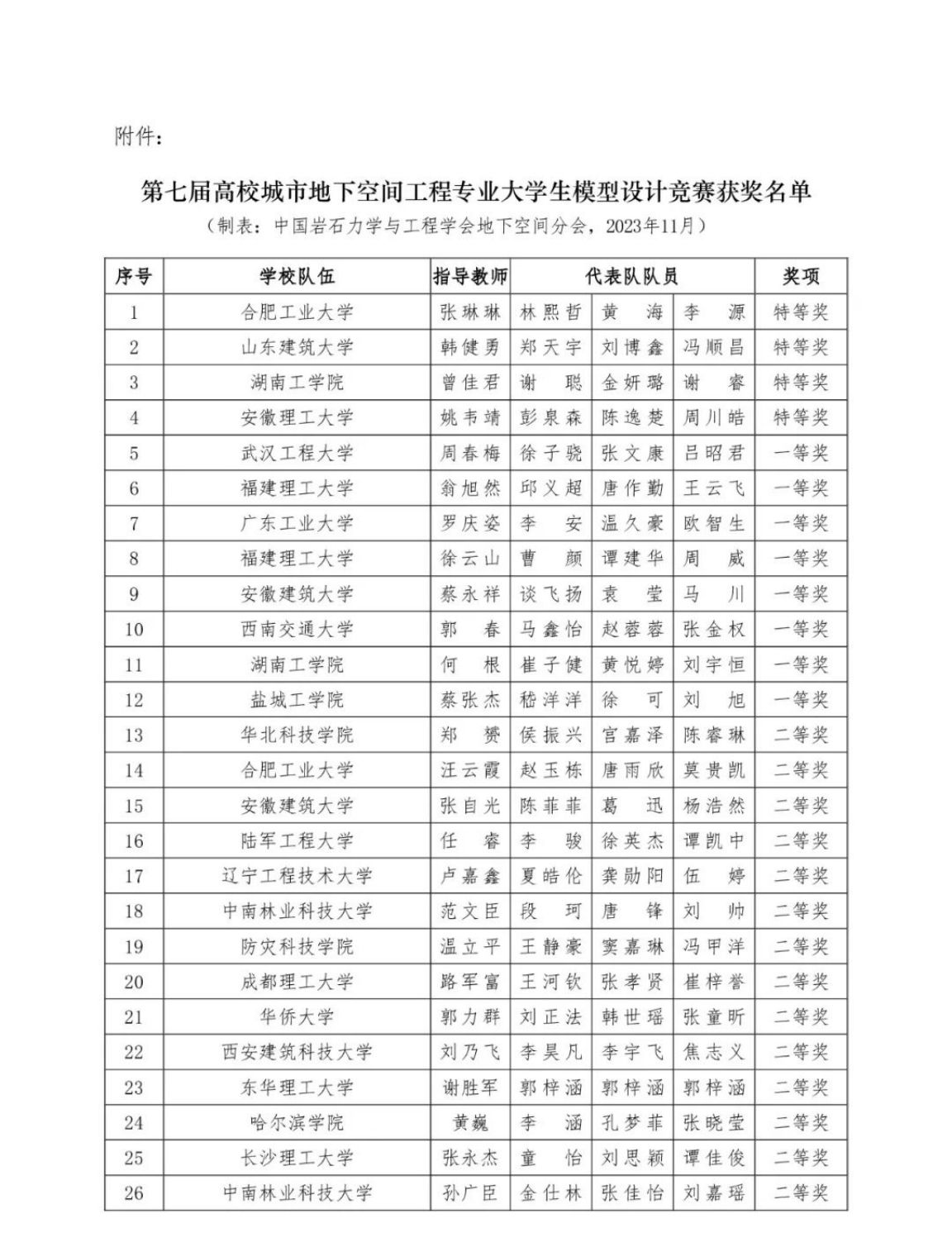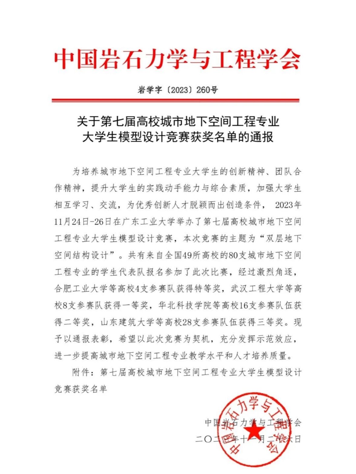 2023年11月24日至26日,由教育部高等公司土木工程专业教学指导分委员会、中国岩石力学与工程学会主办,广东工业大学承办的第七届全国高校城市地下空间工程专业老员工模型设计竞赛圆满举行。本次竞赛的主题为“双层地下空间结构模型设计”,共有来自全国49所高校的城市地下空间工程专业80支代表队报名参加了此次比赛,经过激烈角逐,公司城市地下空间工程专业蔡张杰老师指导的参赛队(成员:B城市211班嵇洋洋、B城市211班徐可、B城市211班刘旭)以优异成绩荣获全国一等奖。