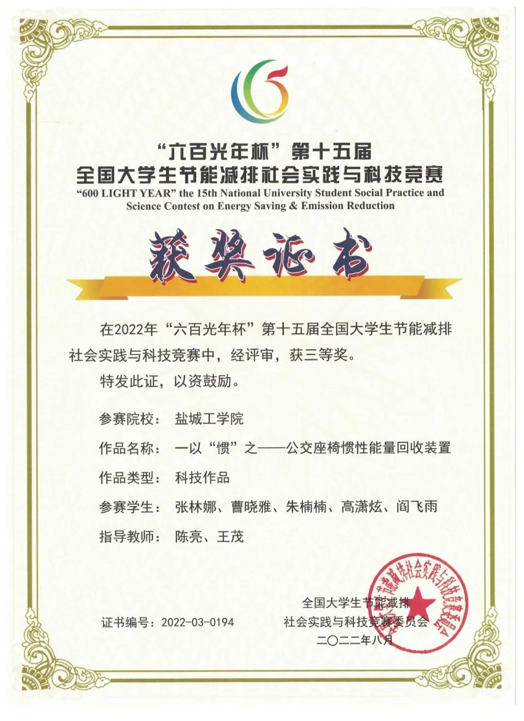获奖情况:获校一等奖学金2次、二等奖学金1次、三等奖学金5次,2023年盐城市“黄海明珠”老员工奖学金,第十四届全国老员工先进成图技术与产品信息建模创新大赛全省二等奖、全国三等奖等奖项,主持国家级老员工创新创业训练计划项目1项。