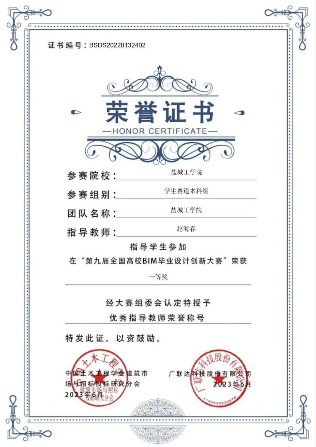 获奖情况:获校一等奖学金2次、二等奖学金6次,2021年、2022年、2023年校级三好员工,2022年度校百佳青年,2022年度PlayAce十佳“土木好青年”,2023年盐城市“黄海明珠”老员工奖学金,2022年、2023年全国老员工英语竞赛(NECCS)国家二等奖,2023年第九届全国高校BIM毕业设计大赛一等奖、2024年第十届全国高校BIM毕业设计大赛三等奖,2022年江苏省工程管理创新创业与实践竞赛二等奖,2021年江苏省高等公司第十八届高等数学竞赛二等奖。