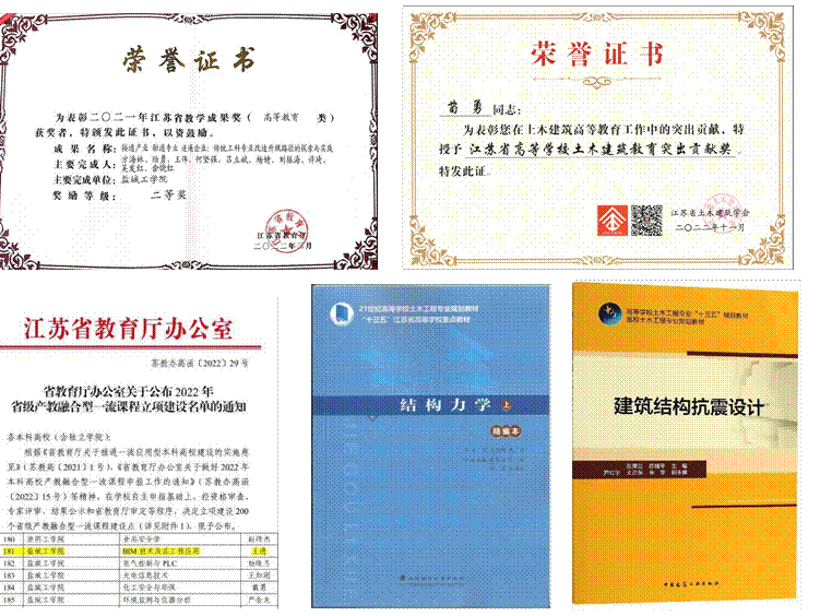 土木工程专业教师具有明确的科研方向,科研经历丰富,涉及面广,近三年,新引进优秀博士6名;新增江苏高校“青蓝工程”优秀教学团队1个,江苏省教学名师1人,江苏省产业教授2人,省级人才工程10人;获批省部级教改课题14项,国家级和省级教学成果奖二等奖各1项,发表教研论文40余篇,新增省部级重点规划教材5部;获国家级一流本科课程3门,省级一流本科课程、产教融合课程、课程思政示范课程3门;获批国家级科研项目6项,省部级科研项目16项,纵横向科研到账经费3000余万元,发表SCI、EI检索论文86篇,授权发明专利37件,省部级以上科技奖励12项。47%以上的专职教师具有参与国内外学术会议、出国短期访问的经历。本专业教师大多担任了专业基础课程和专业课程的主讲任务,教师的科研成果反哺于教学过程的各个环节,有力的推动了教学质量的提高。
