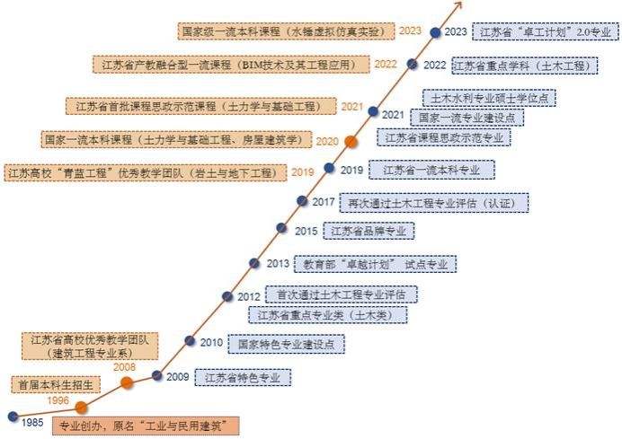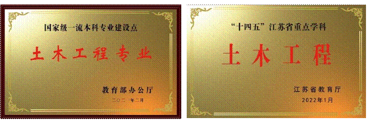 近20年来,土木工程专业不断发展壮大,2009年获评江苏省特色专业,2010年成为国家特色专业建设点,2012年首次通过住建部土木工程专业评估,同年获江苏省土木类重点专业,2013年获教育部“卓越计划”试点专业,2015年入选江苏省品牌专业一期工程,2017年通过中国工程教育专业认证,2019年获批江苏省一流本科专业建设点,2021年获批国家级一流本科专业建设点,同年入选江苏省首批课程思政示范专业,2023年获江苏省“卓工计划”2.0专业。2012年首次通过土木工程专业评估,2023第三次参加国家工程教育专业认证。