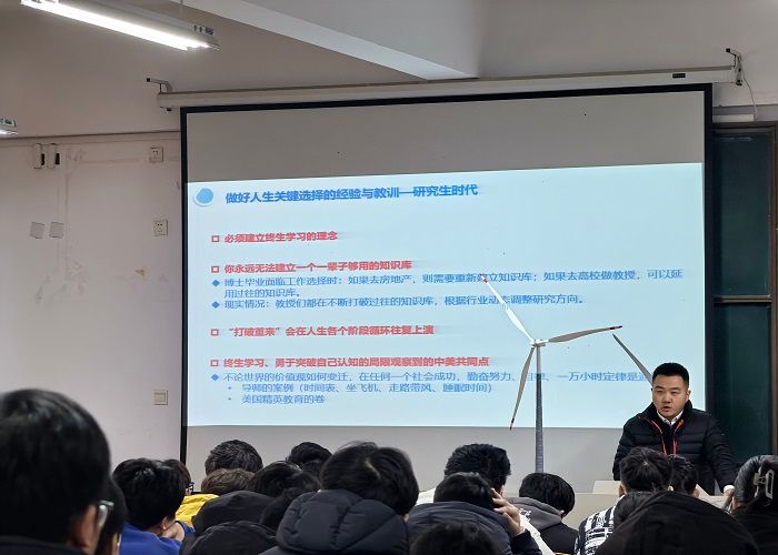 上官鹏程结合自身土木工程专业国内外求学经历、在人生关键选择的经验与教训、土建行业发展现状以及企业发展情况给同学们带来一节生动的就业指导课,勉励同学们树立远大目标,强化终身学习的理念,提升自身核心竞争力。