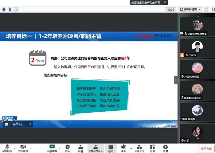 2022年11月23日晚,公司组织2023届土木工程、给排水、建能专业毕业生在腾讯会议线上参加了绿都智慧服务空中宣讲会。