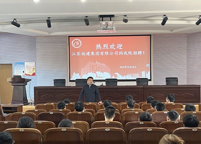 2023年10月25日上午,江苏扬建集团有限公司党委办公室主任、人力资源部部长卫喜亮应邀到公司开展2024届毕业生就业指导课,公司党委副书记陈广正、学工办负责人、毕业班辅导员、毕业生代表100余人参加。